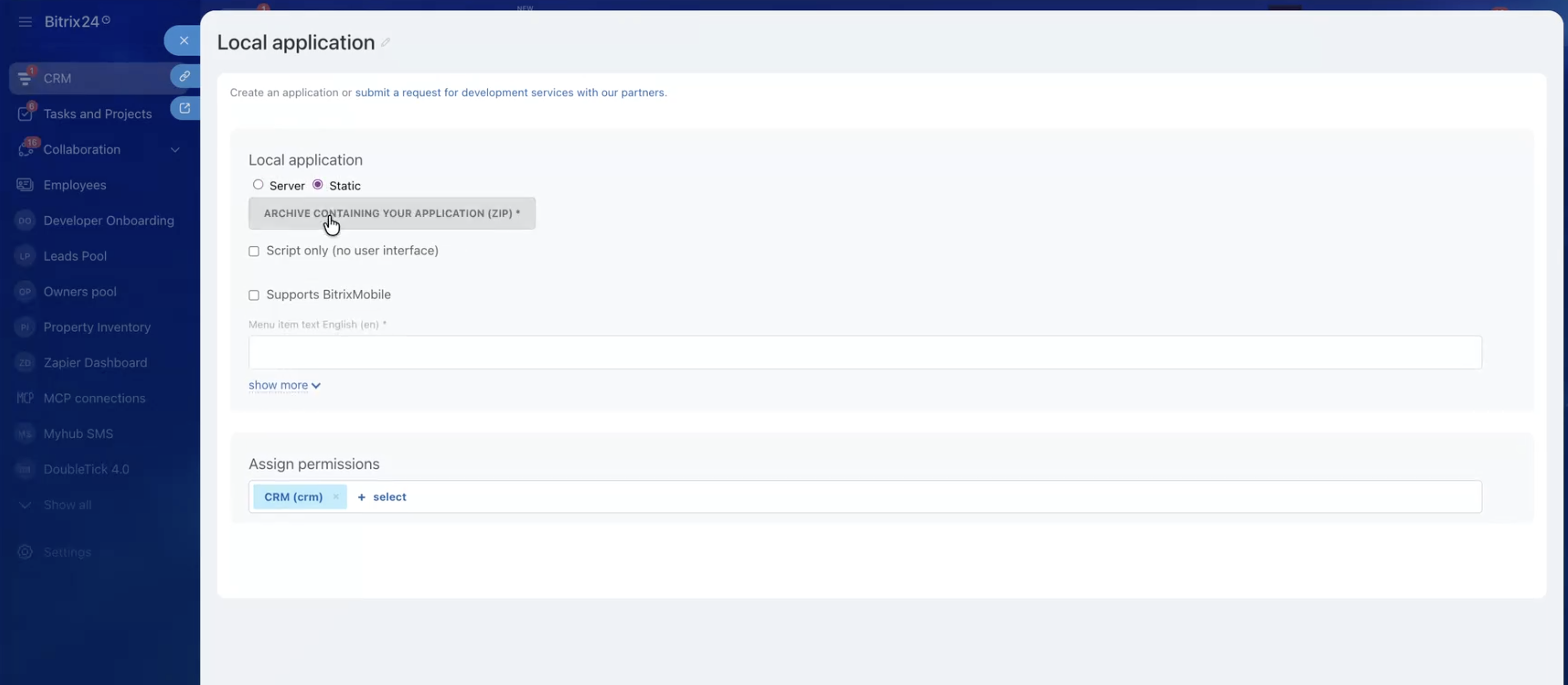 | Assign permissions | CRM (crm), Users (user), Application embedding (placement) |